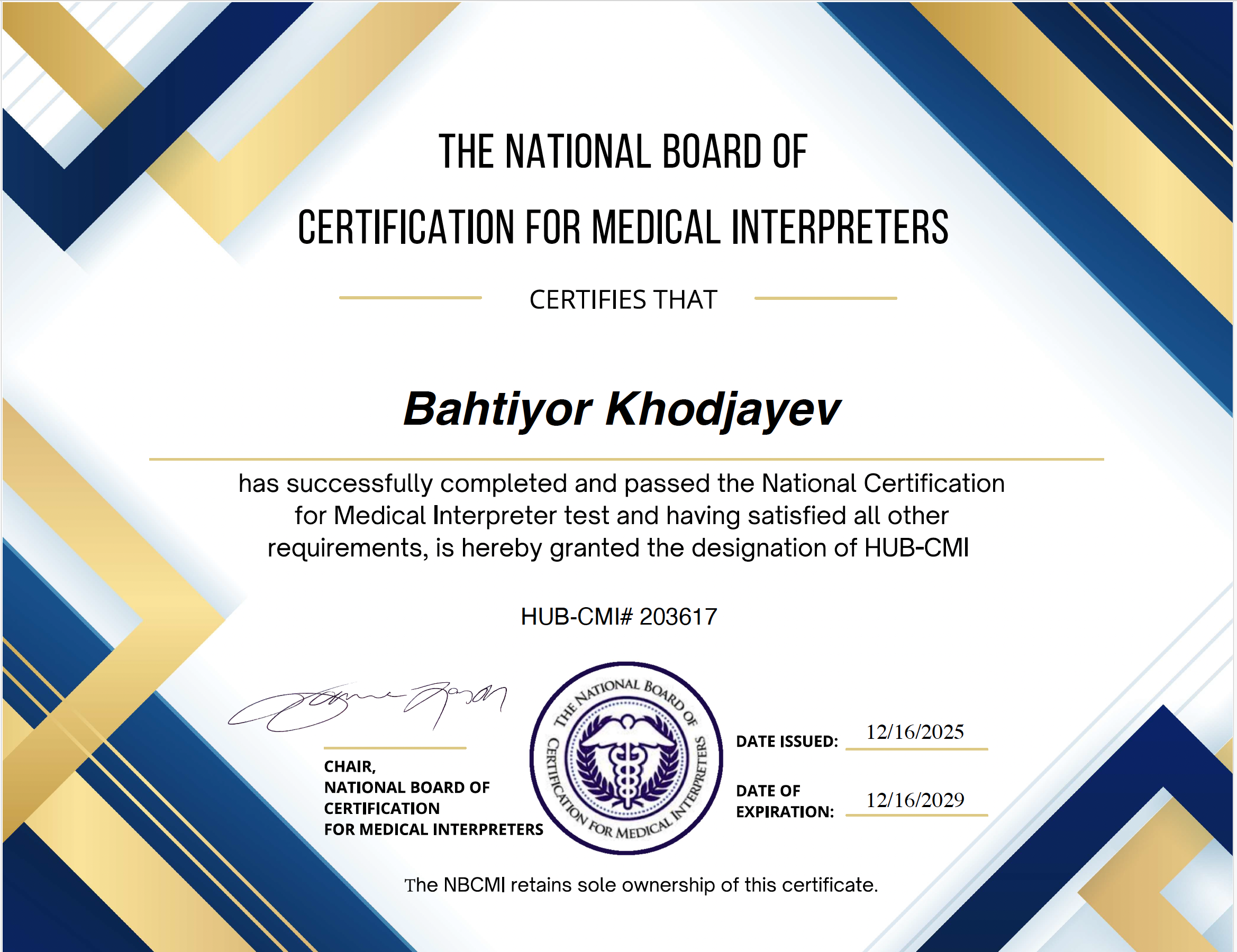 Bakhtiyor Khodjayev (“Bak”) is a Certified Interpreter, Translator, and Interpreter Trainer, as well as the Founder of Baklingual Solutions, a Canadian language service provider. He is NBCMI Certified Medical Interpreter with over 15 years of hands-on experience delivering high-quality interpretation, translation, and interpreter training services across the United States and Canada. Bak has provided language services for major institutions, including Immigration, Refugees and Citizenship Canada (IRCC), the Immigration and Refugee Board of Canada (IRB), the Canada Border Services Agency (CBSA), U.S. state courts, social services agencies, U.S. Immigration and Customs Enforcement (ICE), 911 emergency services, and detention facilities.